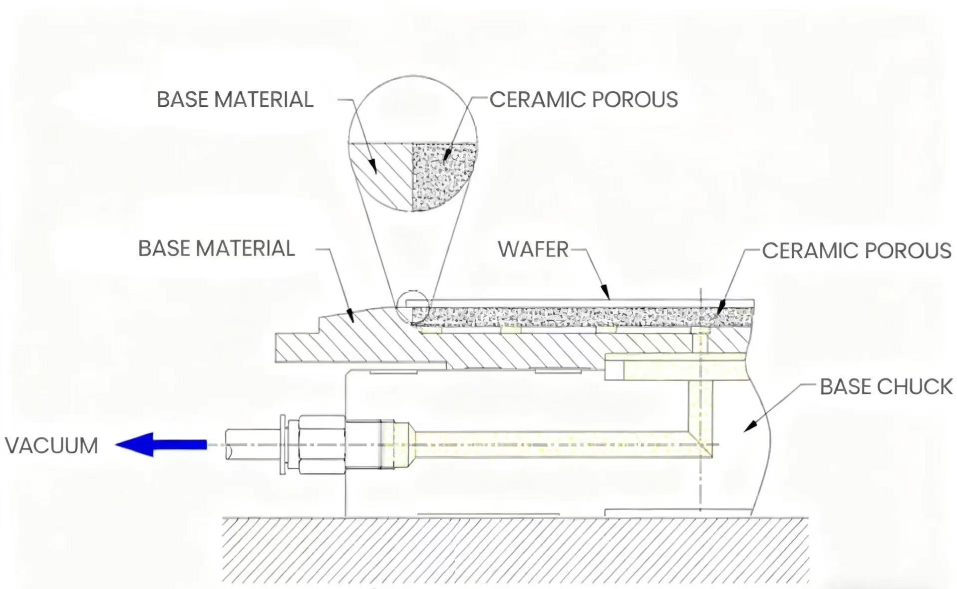 カスタマイズされた多孔質セラミックチャックベースと多孔質セラミックプレートで構成されます。真空システムに接続し、ウェーハとセラミックの間の空気を排気することで低圧環境を作り出します。真空負圧下でウエハをチャック面に強固に吸着させ、安全かつ安定した固定・位置決めを実現します。