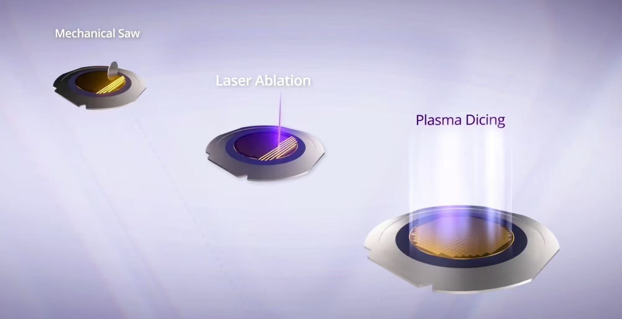プラズマダイシングは、チップ生産効率と 1 枚のウェーハあたりのチップ生産量を大幅に向上させることができます。ダイヤモンドブレードやレーザーダイシングではスクライブラインに沿って1本ずつダイシングする必要がありますが、プラズマダイシングでは全てのスクライブラインを同時に加工できるため、チップの生産効率が大幅に向上します。プラズマダイシングは、ダイヤモンドブレードの幅やレーザースポットのサイズによって物理的に制限されず、ダイシングストリートをより狭くすることができるため、1枚のウェーハからより多くのチップを切り出すことができます。この切断方法により、ウェーハのレイアウトが直線切断パスの制約から解放され、チップの形状とサイズの設計における柔軟性が向上します。これにより、ウェーハ領域が最大限に活用され、機械的なダイシングのためにウェーハ領域を犠牲にしなければならない状況が回避されます。これにより、特に小型チップの場合、チップの生産量が大幅に増加します。