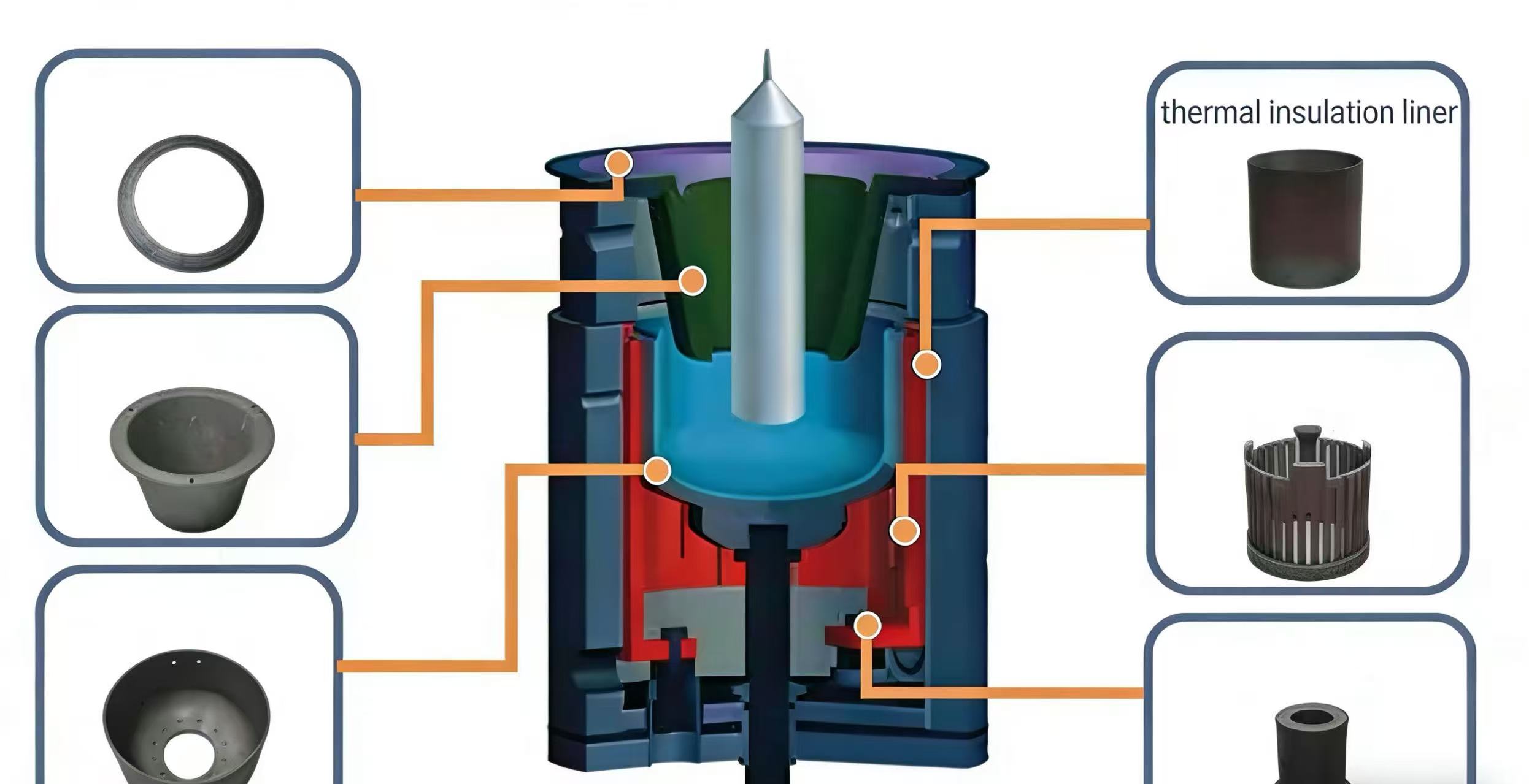 PV カーボンセラミック断熱ライナーこれらは通常、るつぼ、フローガイドシリンダー、加熱コンポーネントなどのコンポーネントとともに、太陽光発電ホットゾーンシステムのるつぼの外側に配置されます。主に補助断熱、断熱、構造支持の機能を果たす PV カーボンセラミック断熱ライナーは、太陽光発電ホットゾーン内の温度の均一性と安定性を維持するのに役立ち、シリコンの溶解と成長に適した動作条件を提供します。