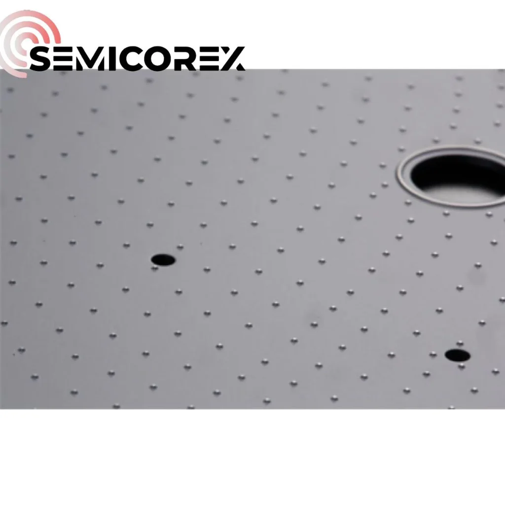セミコレックスの表面炭化ケイ素ピンチャックにはミクロンサイズのバンプが多数配列されています。ウェーハ裏面との接触はバンプでのみ発生するため、接触面積が最小限に抑えられ、ウェーハの不必要な傷、粒子汚染、マーキングが効果的に回避されます。